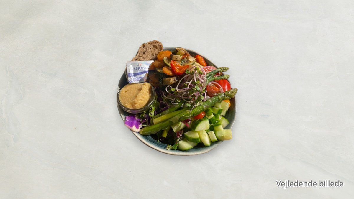 Grillede grøntsager, grønne asparges, blandet salat, cherrytomater, agurk og syltede rødløg. Serveres med hvidløgsmayo, vinaigrette, brød og smør.