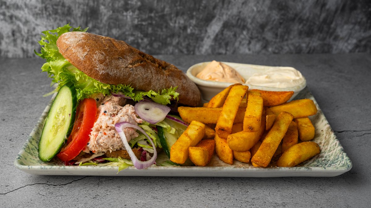 Rustik surdejsbrød med chilimayo, lynstegt oksekød, kyllingestrimler, champignon, peberfløde, rødløg, tomat, agurk, jalapeños, salat og pommes frites.