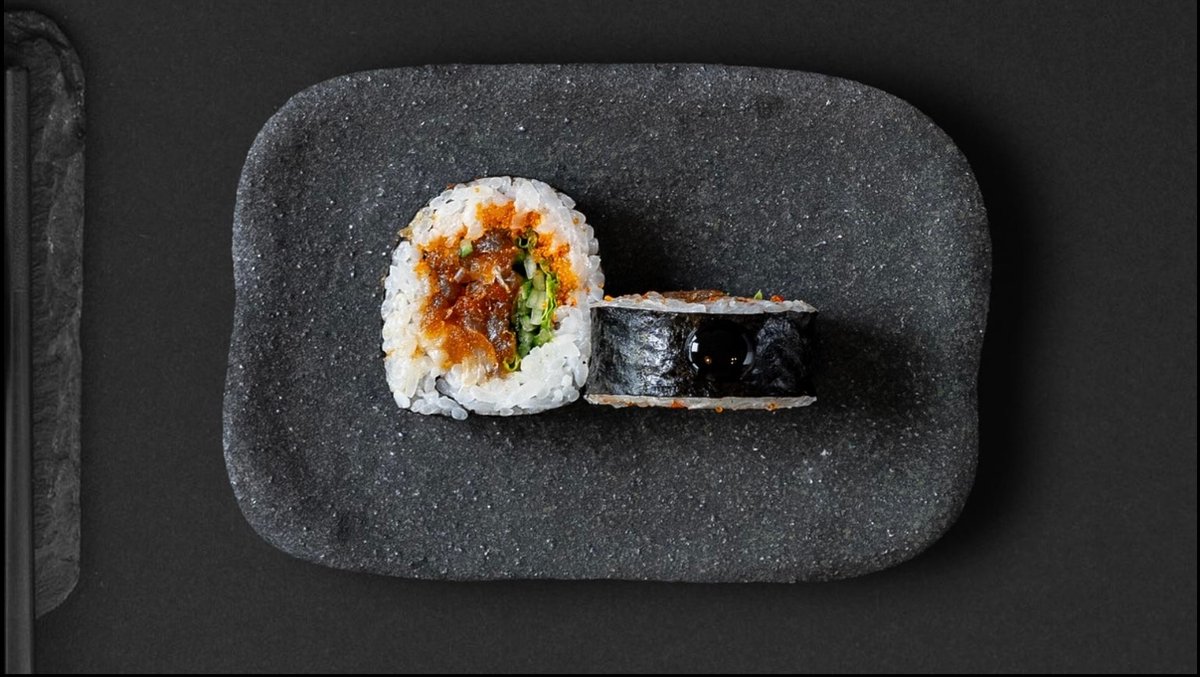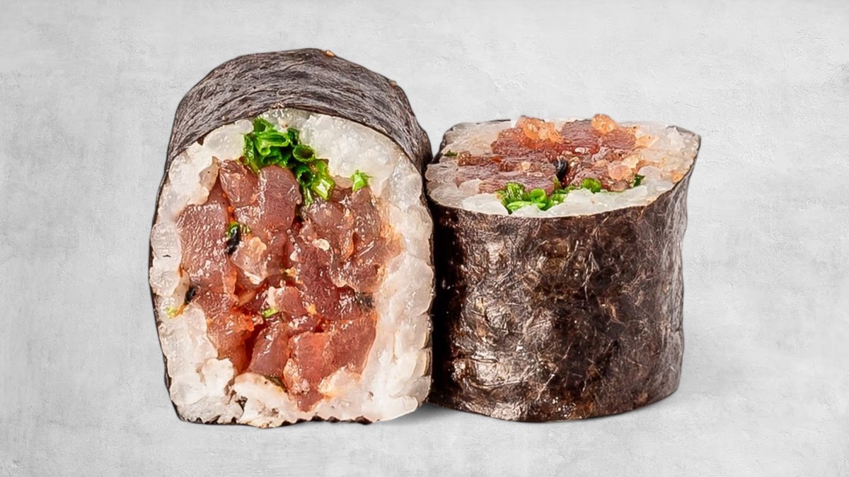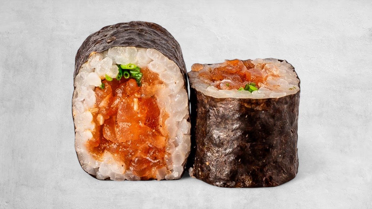 Fyldt med agurk, salat, spicy tun tartar, masago, sesamfrø og teriyakisauce.