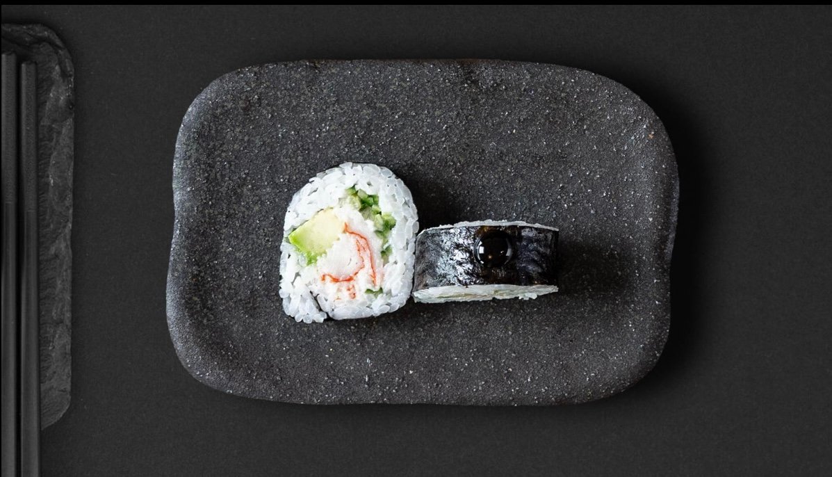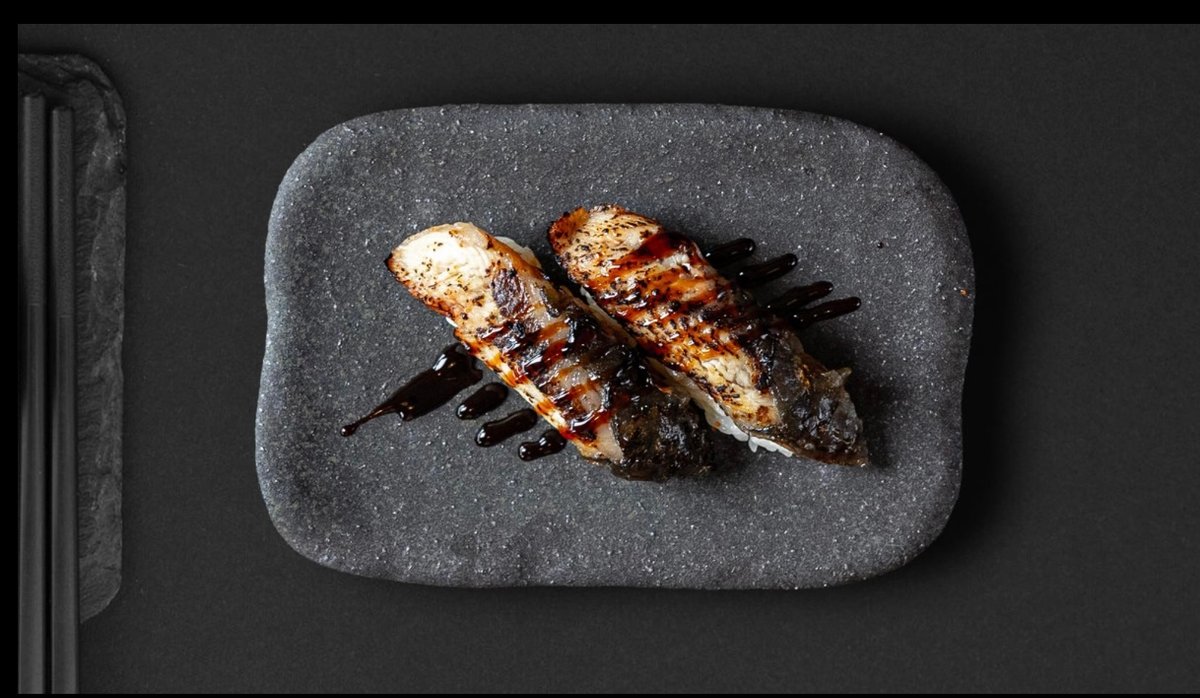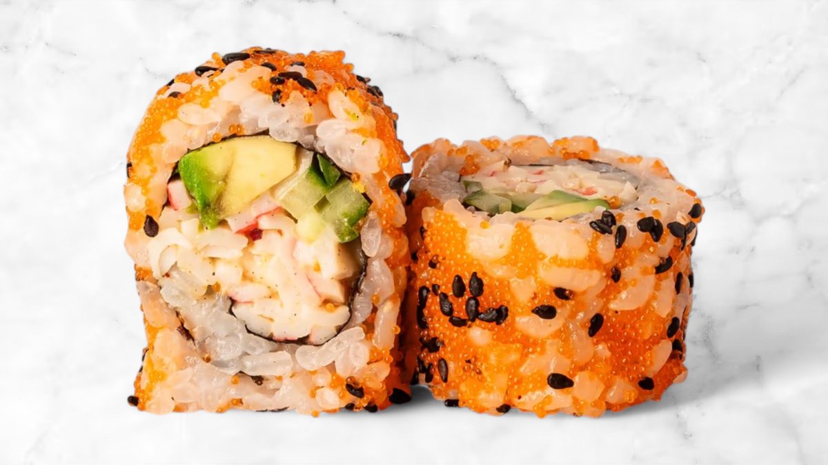 Surimi, agurk og avocado, toppet med flamberet ål, sesamfrø, purløg og teriyakisauce.