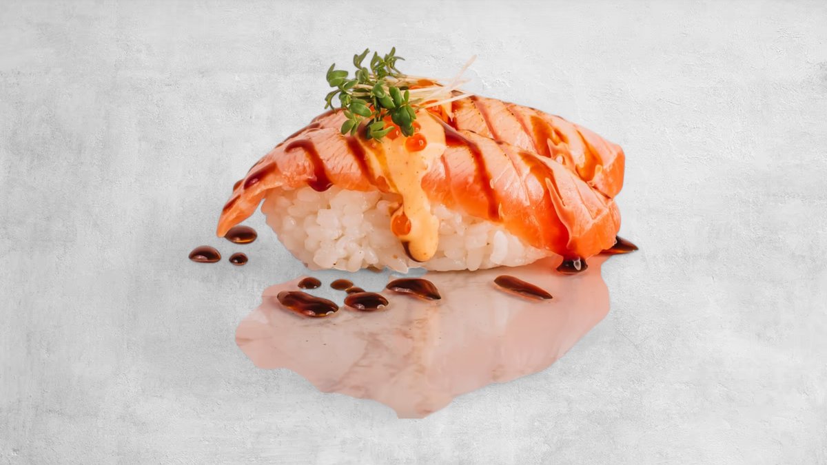 Flamberet laks nigiri med løg, sesamfrø og teriyakisauce.
