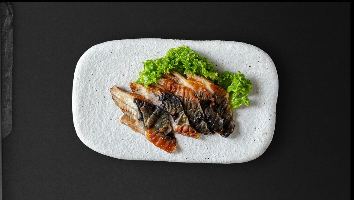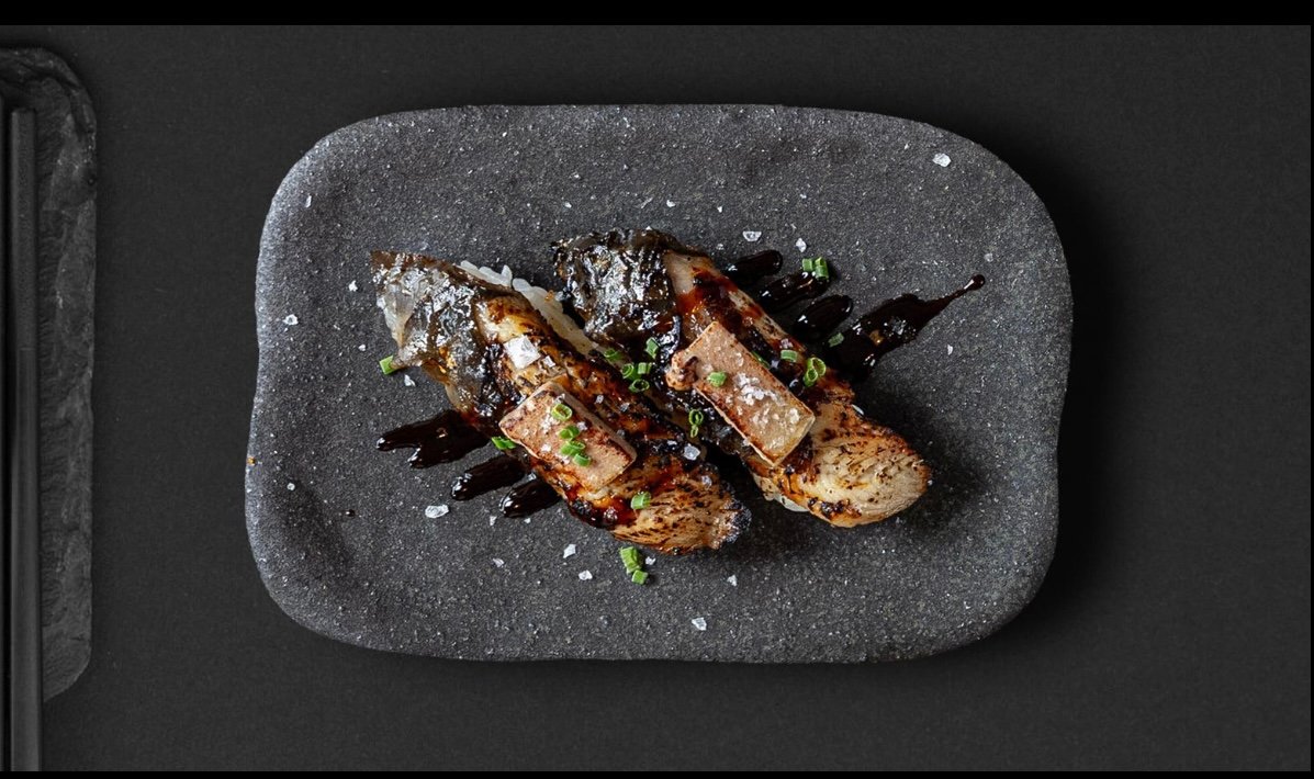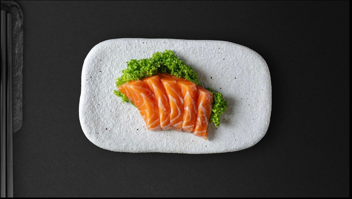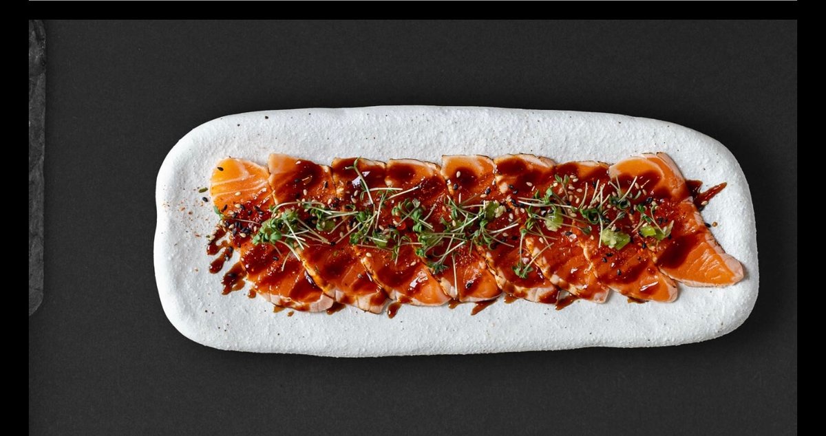 Skiver af laks med et let grillet præg, toppet med shichimi togarashi, kizami wasabi, teriyakisauce og havsalt.