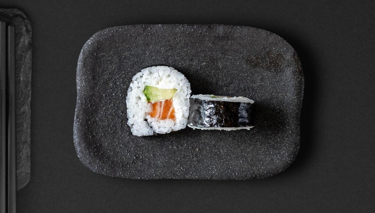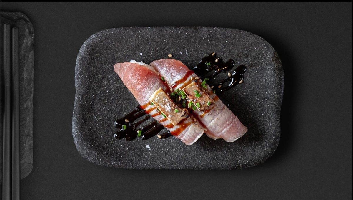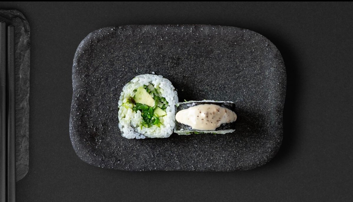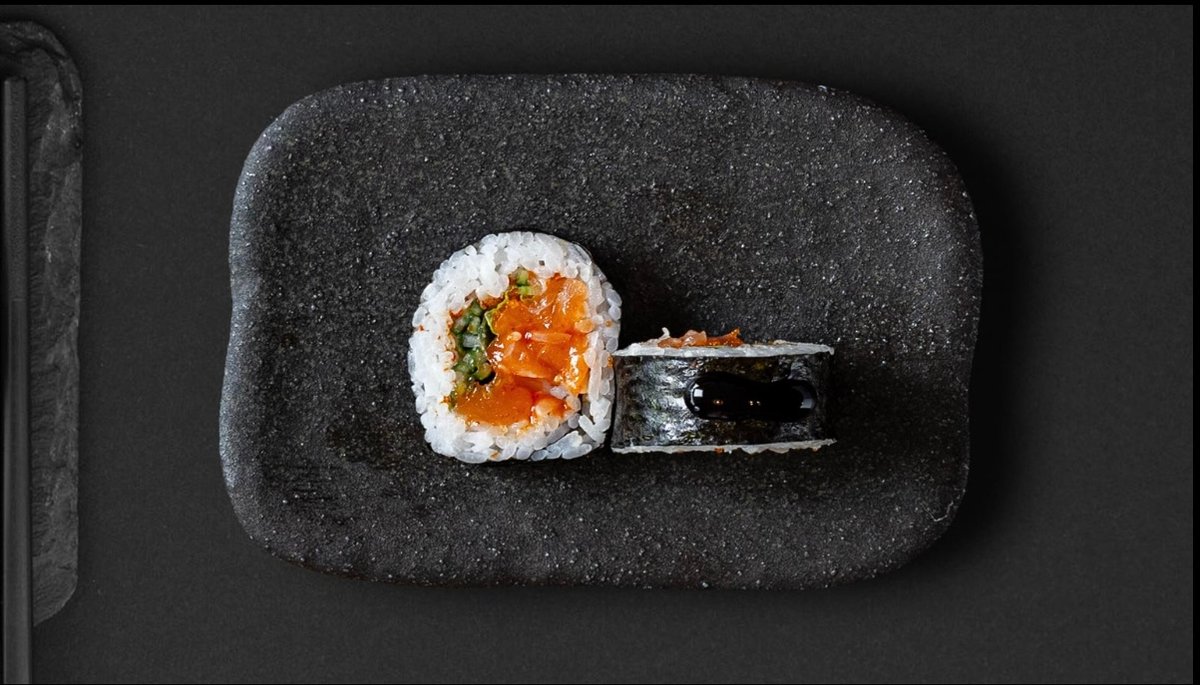 Agurk, laks og avocado, toppet med skiver af avocado, stegt hvidløg, trøffelpasta og teriyakisauce.