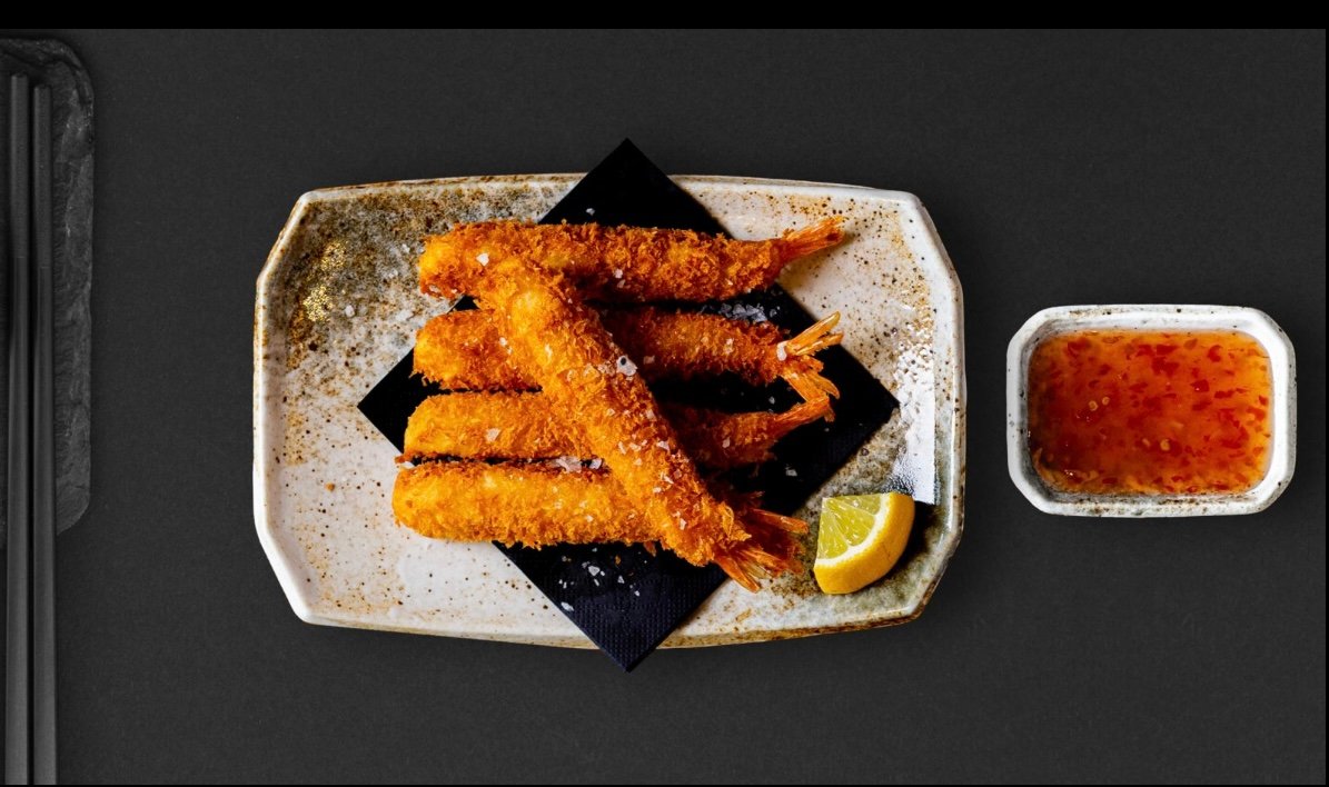 Tempura rejer og agurk, toppet med avocado, teriyakisauce og chilimayo.