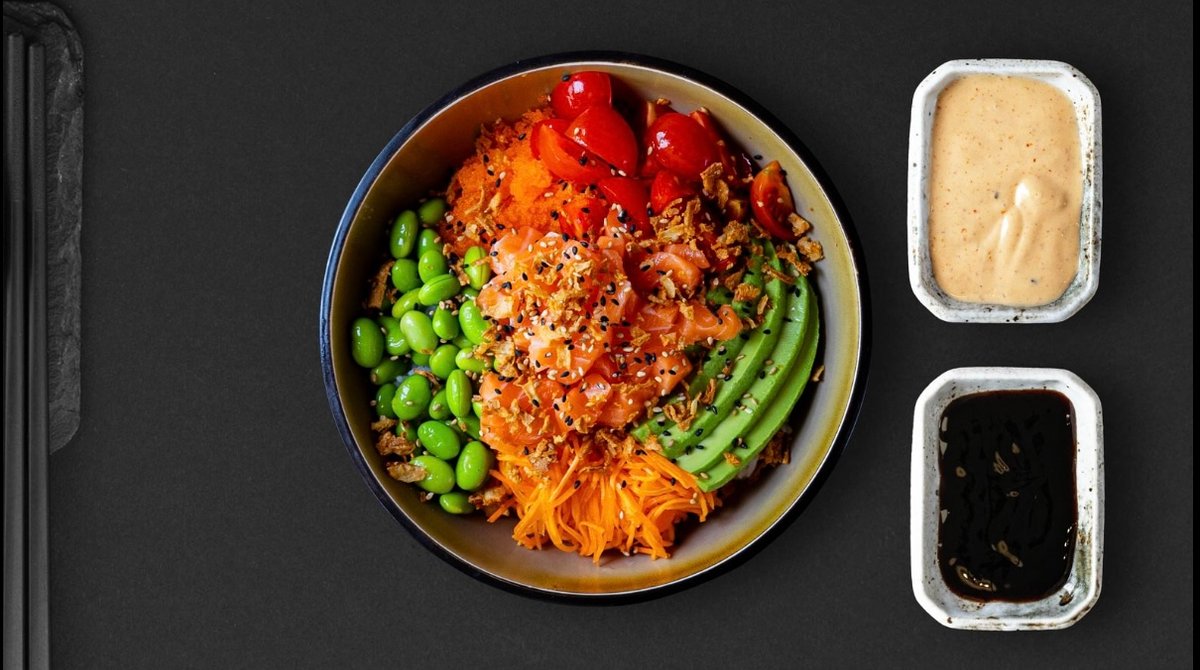 Bund af sushi ris med laks, edamamebønner, syltede gulerødder, avocado, orange masago, cherrytomater, teriyakisauce, chilimayo og toppet med sesamfrø og sprøde løg.
