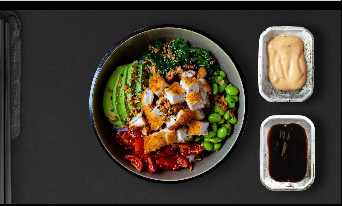 Bund af sushi ris med kylling, edamamebønner, syltede gulerødder, avocado, orange masago, cherrytomater, teriyakisauce, chilimayo og toppet med sesamfrø og sprøde løg.