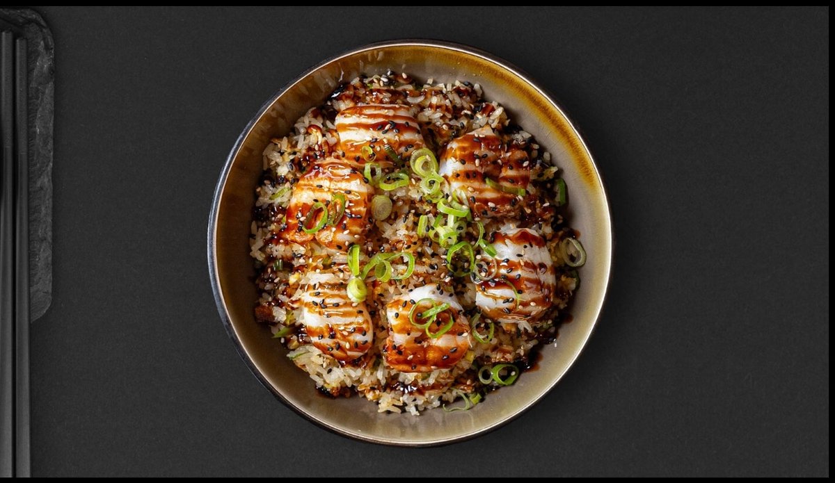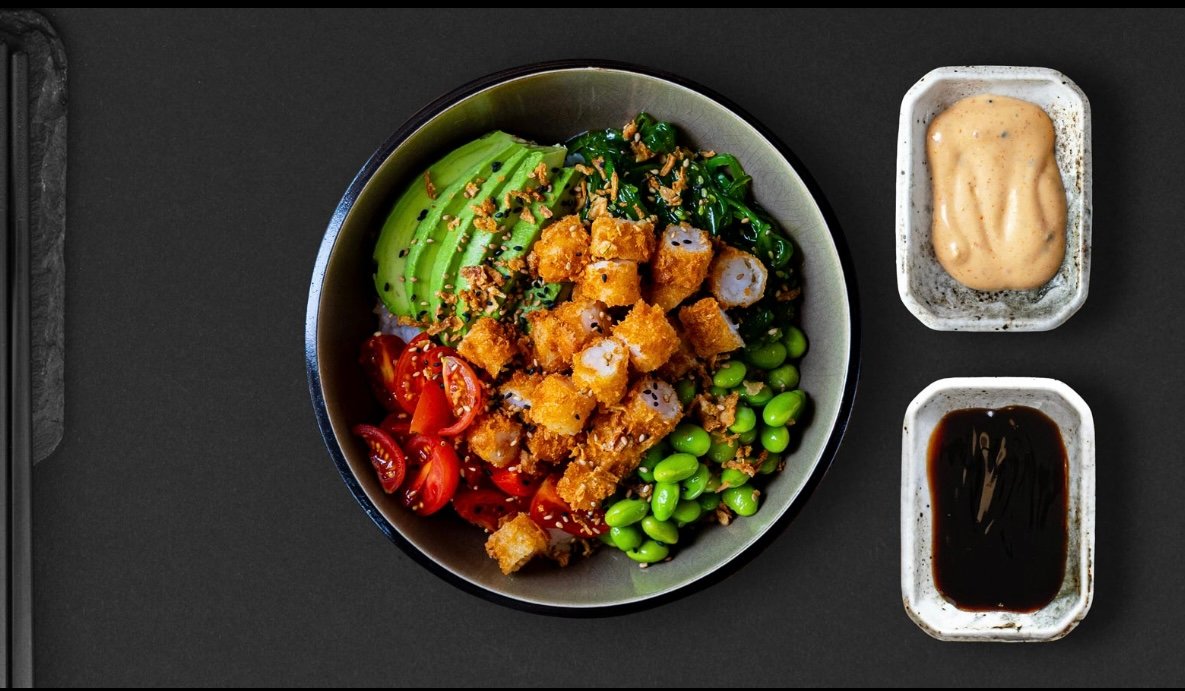 Bund af sushi ris med panerede rejer, edamamebønner, avocado, tangsalat, cherrytomater, teriyakisauce, chilimayo og toppet med sesamfrø og sprøde løg.