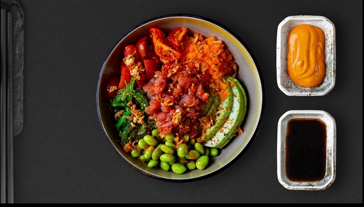Bund af sushi ris med tun, edamamebønner, avocado, tangsalat, cherrytomater, teriyakisauce, chilimayo og toppet med sesamfrø og sprøde løg.