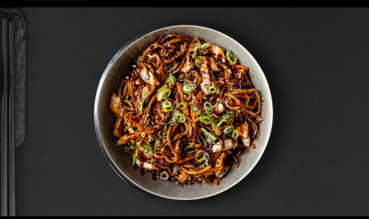 Wok-stegte nudler med grøntsager, kylling, forårsløg, yakisobasauce og sesamfrø.