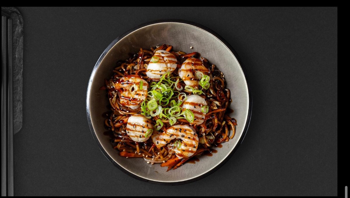 Wok-stegte nudler med grøntsager, rejer, kammuslinger, yakisobasauce, teriyakisauce og sesamfrø.
