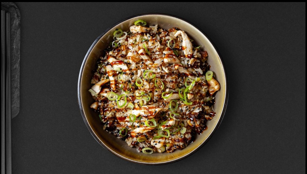 Stegte ris med æg, kylling, forårsløg, hondashi, sesamfrø, glutenfri sojasauce.