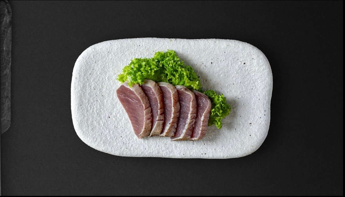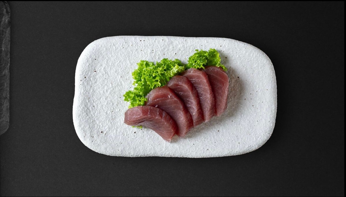 Tunaskiver med karamelliseret løg, purløg, sesamfrø, havsalt og teriyakisauce.