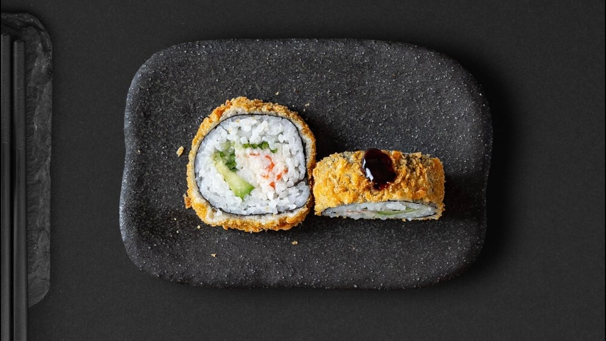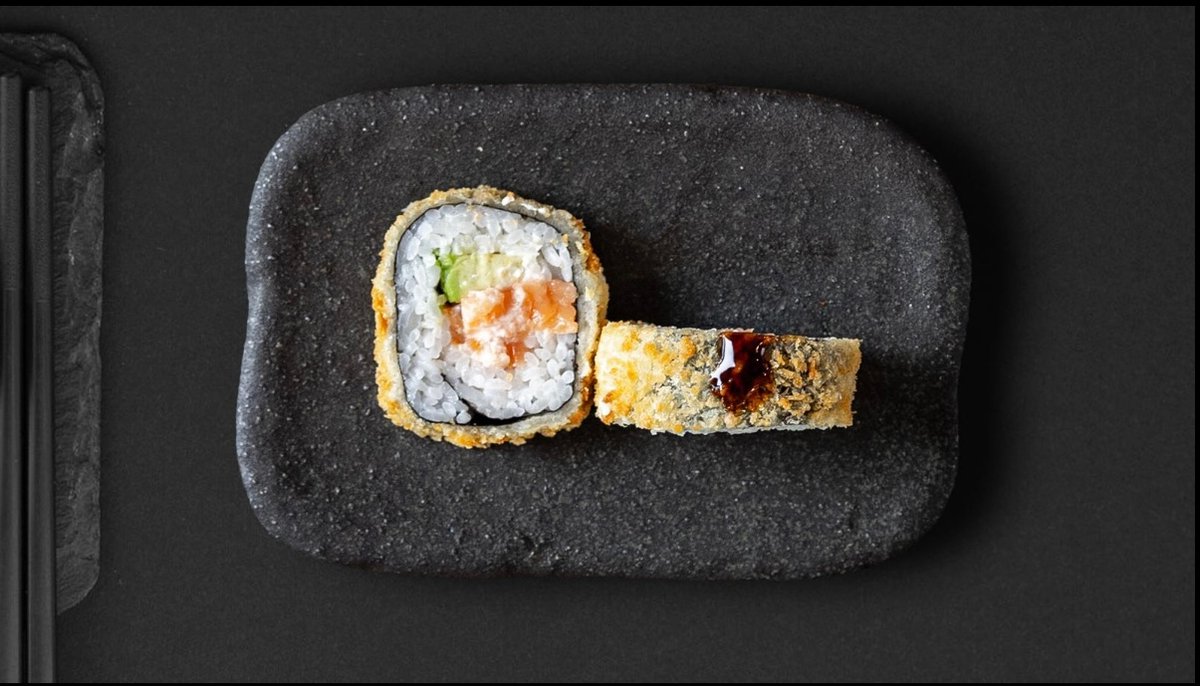 Laks, avocado og flødeost, paneret i panko og toppet med teriyakisauce.