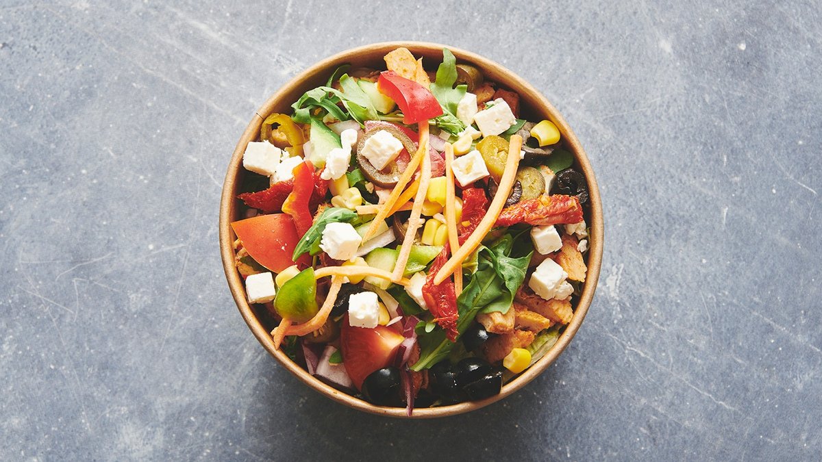 Kylling, cheddarost, frisk salat, tomat, løg, BN' mayo og kethcup i lun brioche bolle