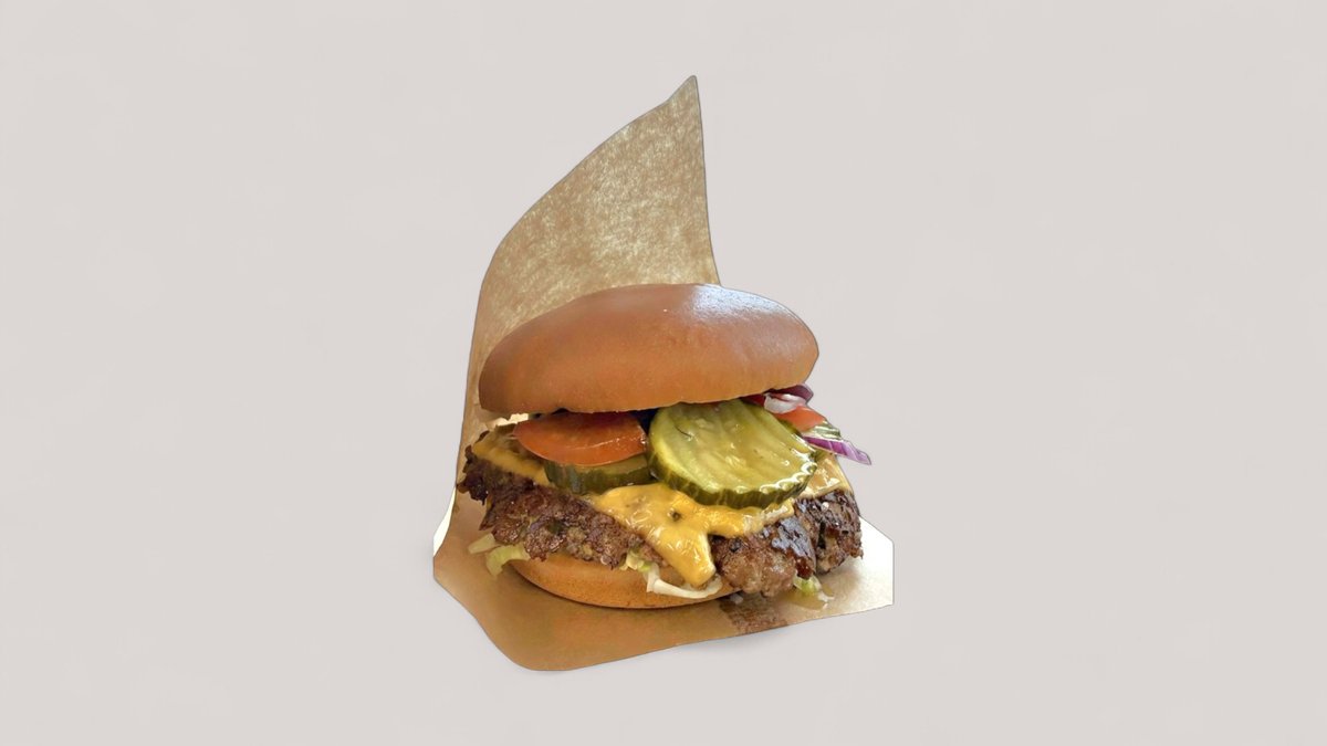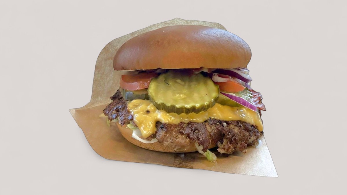 Burgerbolle med fyld af 2 hakkebøf, ost salat, tomat, løg og valgfri dressing.