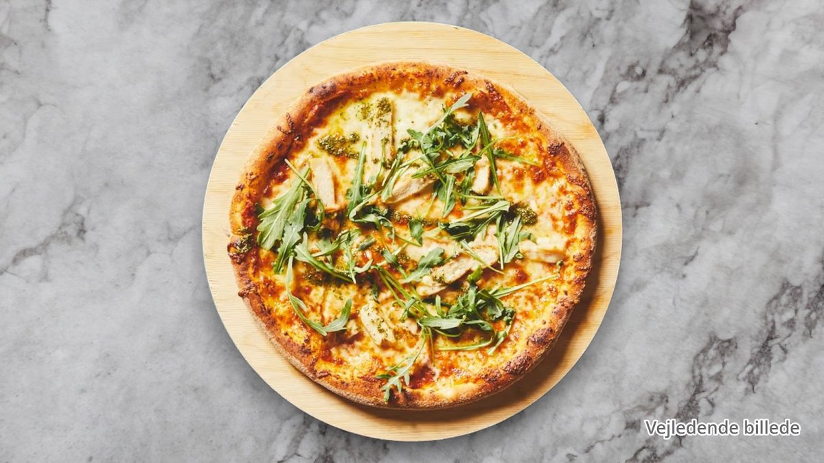 Tomatsauce, ost, kylling, gorgonzola, rucola og pesto.