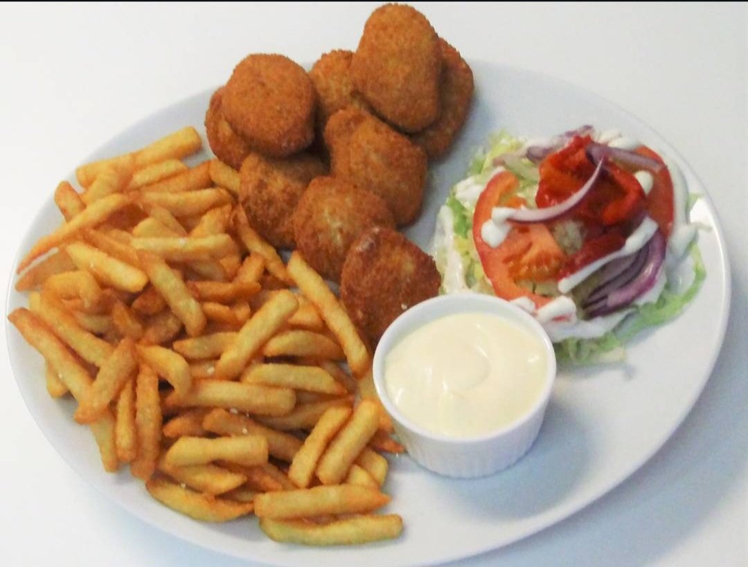 Serveres med pommes frites, blandet salat, valgfri dressing og dyppelse.