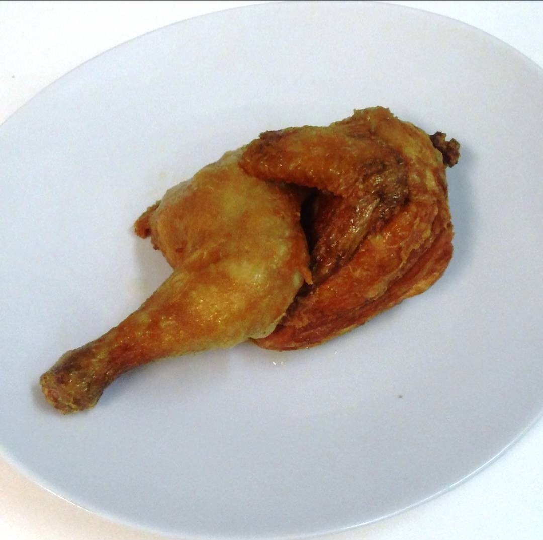 En halv kylling. Serveres med valgfrit tilbehør, blandet salat, valgfri dressing og dyppelse.