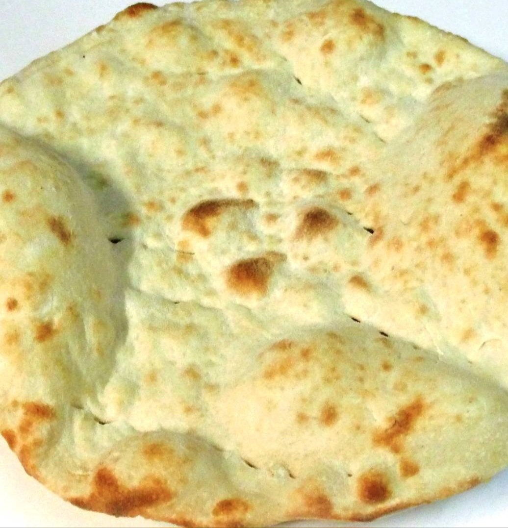 Hjemmelavet fladbrød med valgfri protein, dressing og tomatskiver.