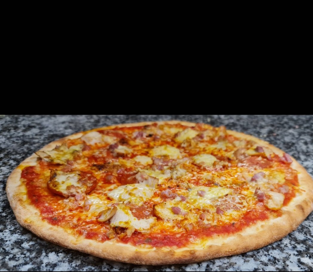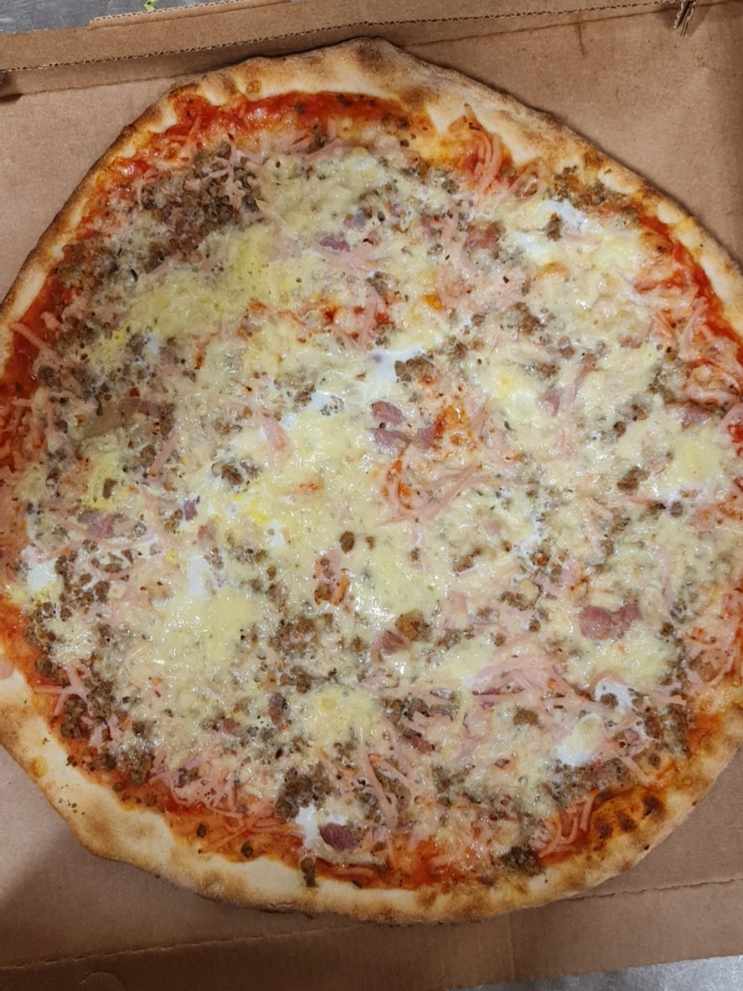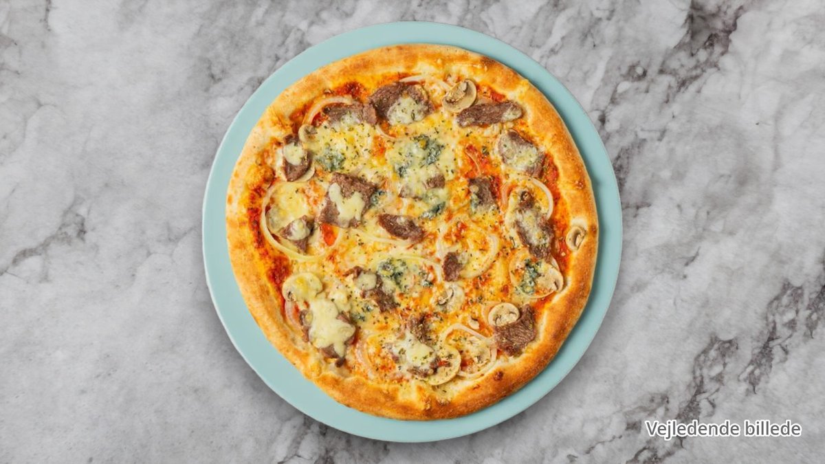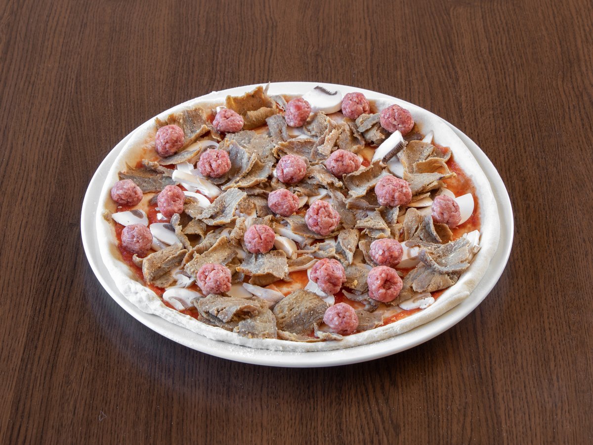 Tomatsauce, ost, skinke, shawarma, champignon, gorgonzola ost og hvidløg.
