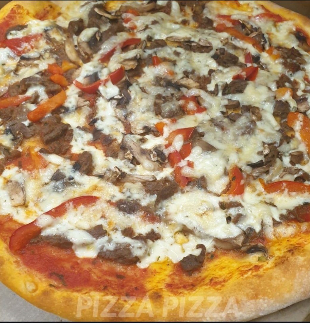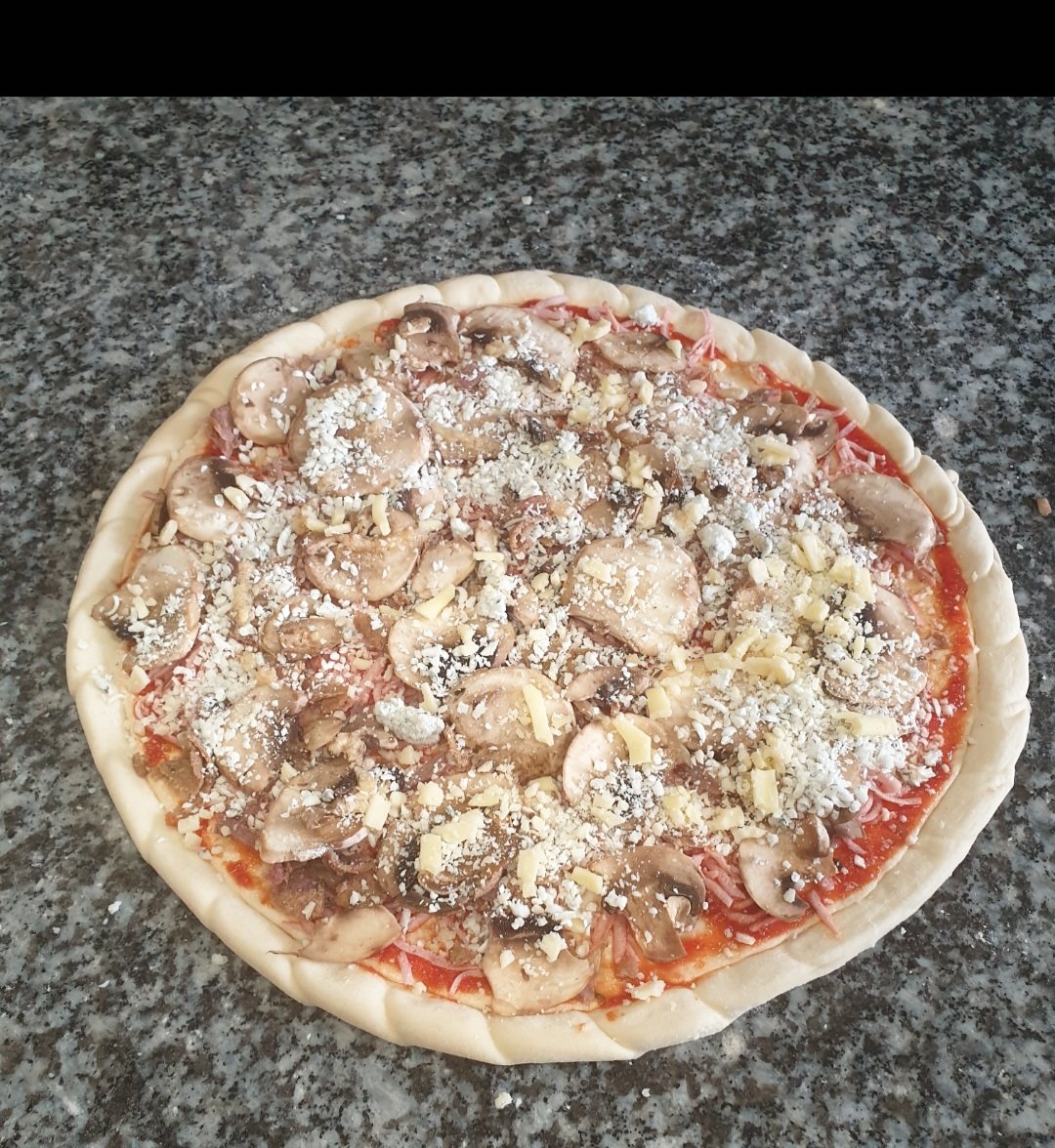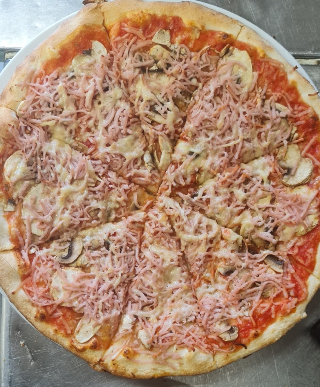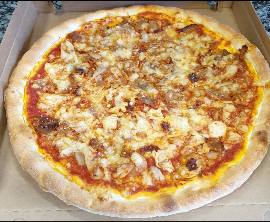 Tomatsauce, ost, skinke, shawarma, champignon, gorgonzola ost og hvidløg.