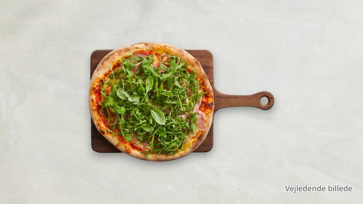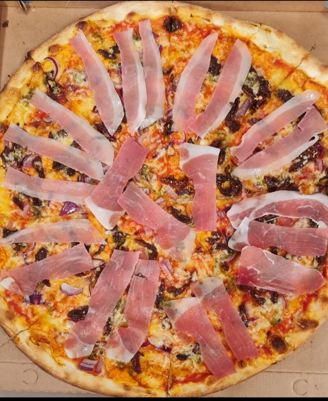 Tomatsauce, ost, soltør. tomat, parmaskinke, pesto og løg.