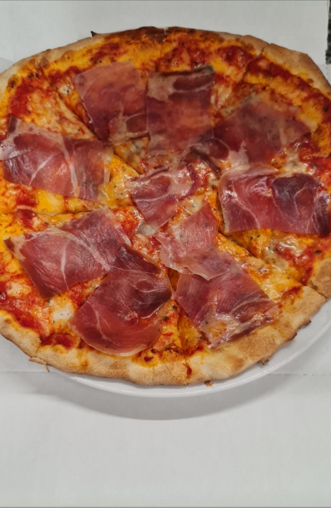Tomatsauce, ost, parmaskinke og gorgonzola.