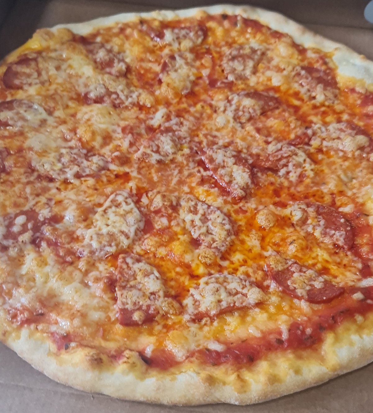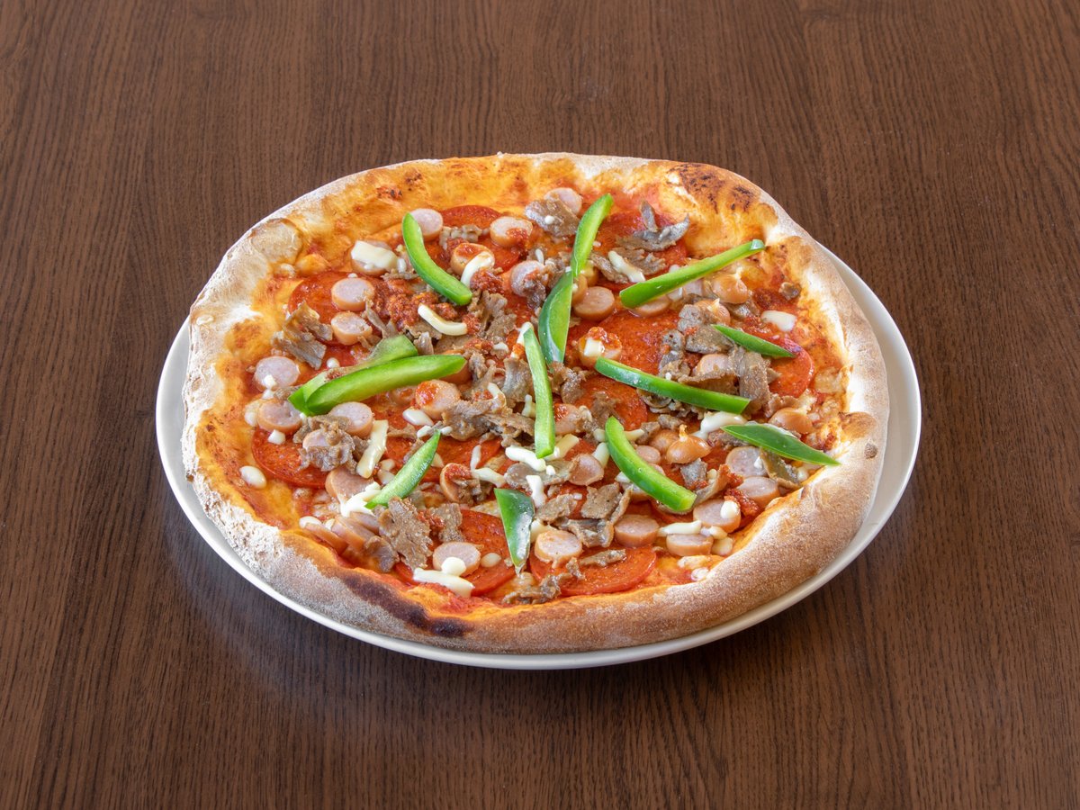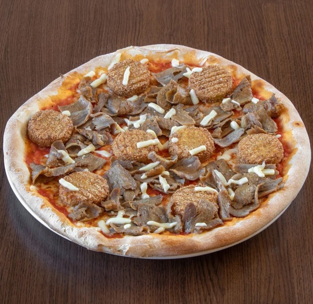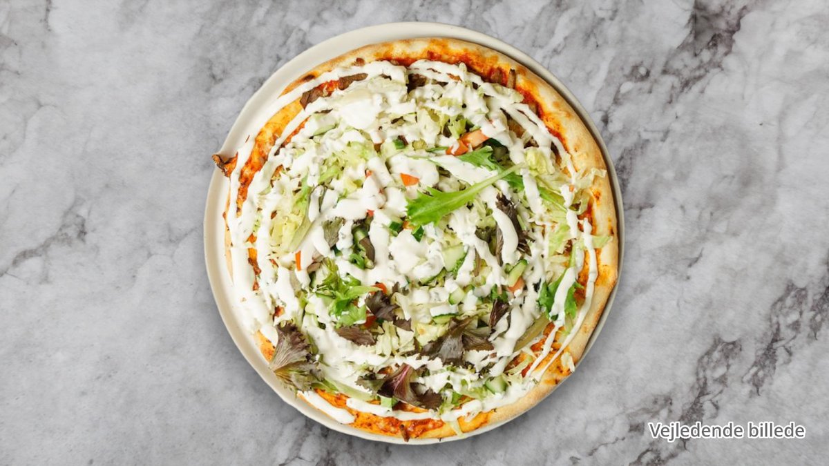 Pepperoni, tomatsauce, shawarma, ost og skinke.