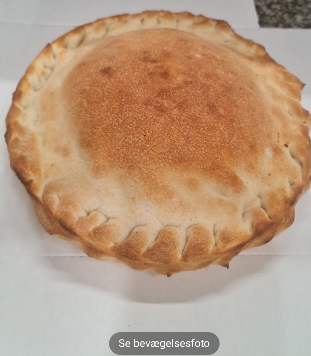 Indbagt pizza med tomatsauce, ost, spaghetti og kødsauce.