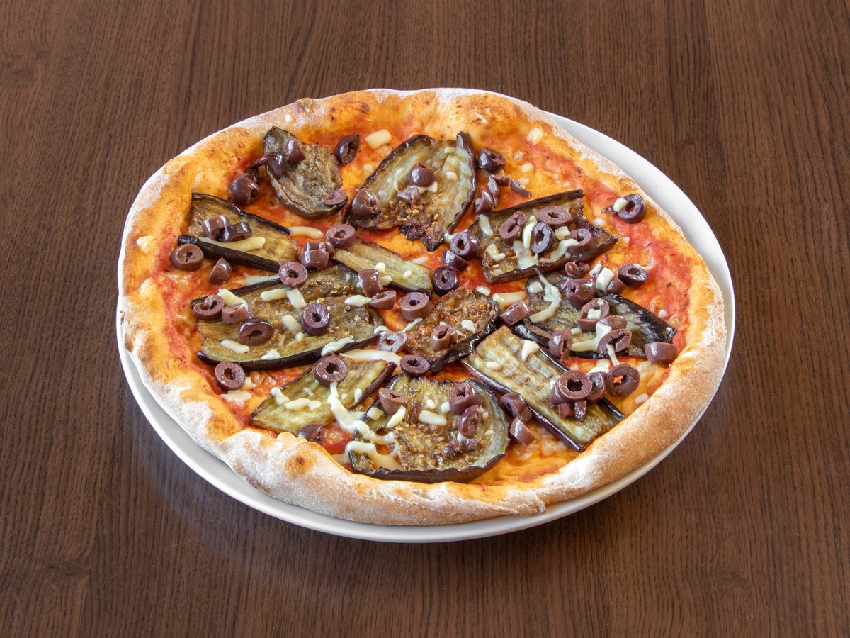 Tomatsauce, ost, aubergine, sorte oliven og gorgonzola.