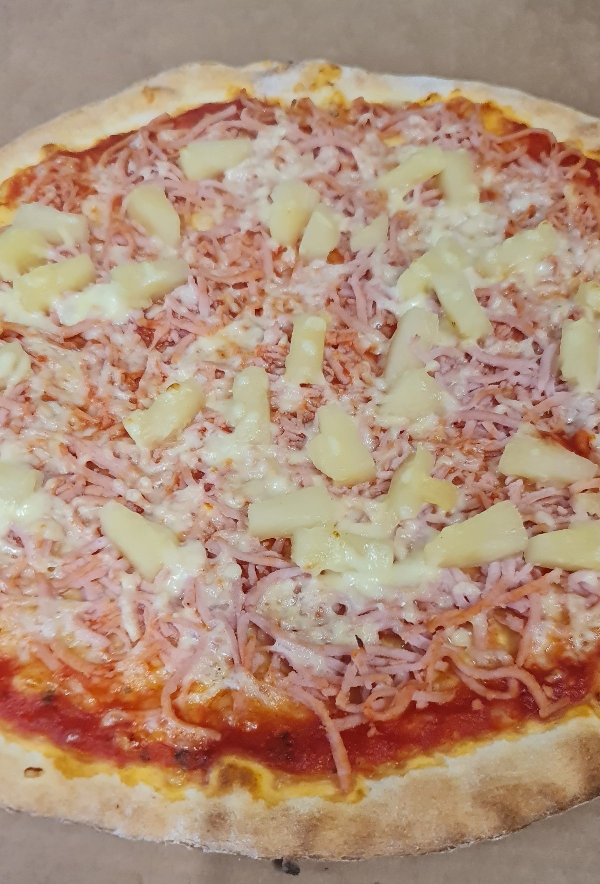 Tomatsauce, ost, ananas, champignon, oliven, løg, artiskok og aubergine.