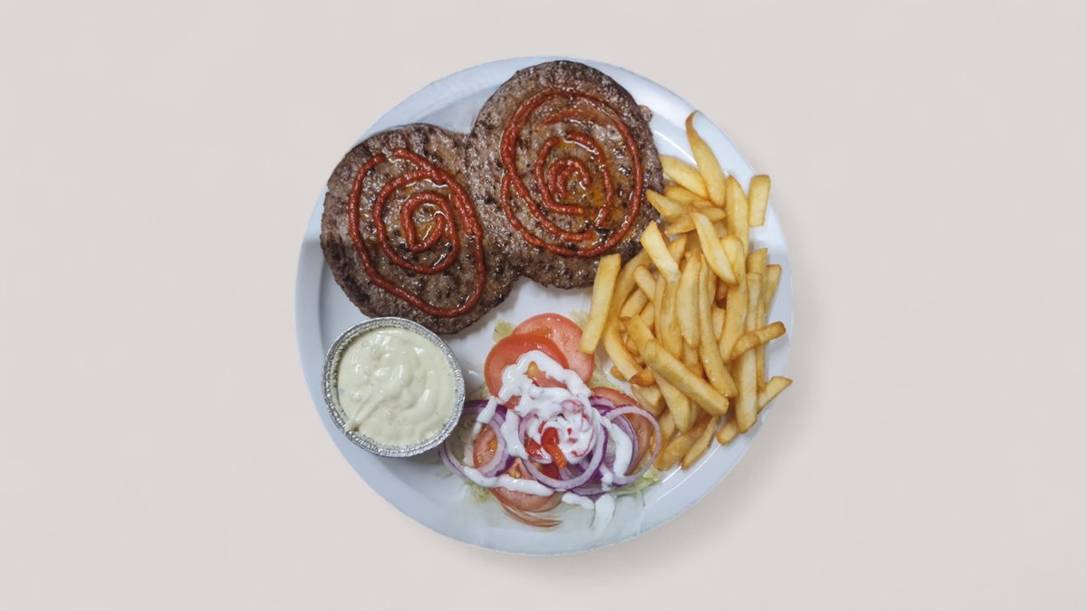 Hjemmelavet burgerbolle med fyld af to oksebøffer, ost, salat, syltet agurk, tomat og smørelse. Serveres med pommes frites, salat, valgfri dyppelse og valgfri drikkevare.