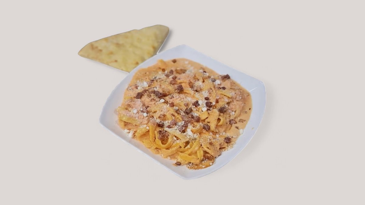 Båndspaghetti med skinke, bacon, champignon, parmesanost og tomatfløde. Serveres med hjemmelavet brød.