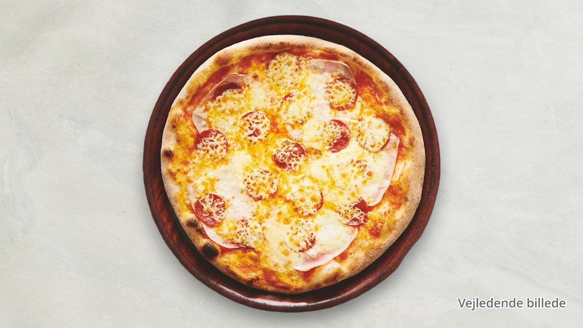 Tomatsauce, ost, skinke, pepperoni og bacon.