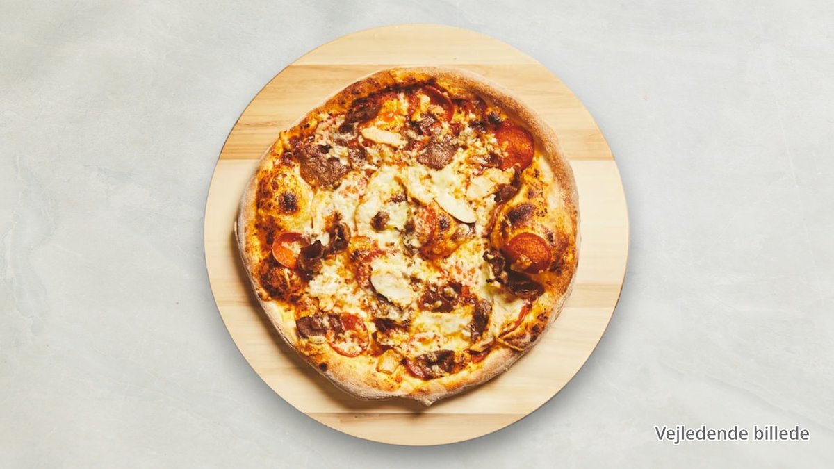 Tomatsauce, ost, skinke, kødboller og bacon.