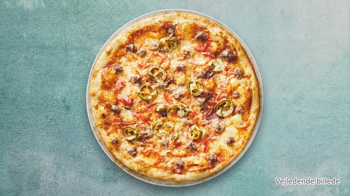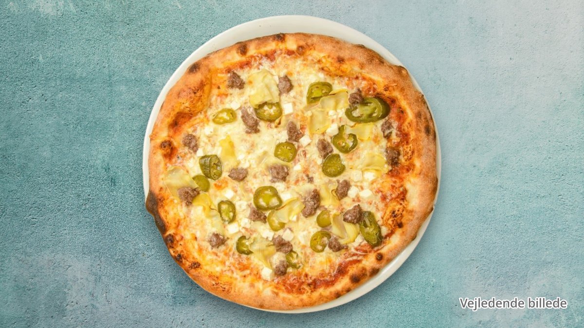 Tomatsauce, ost, skinke, oksefars, bacon og æg.
