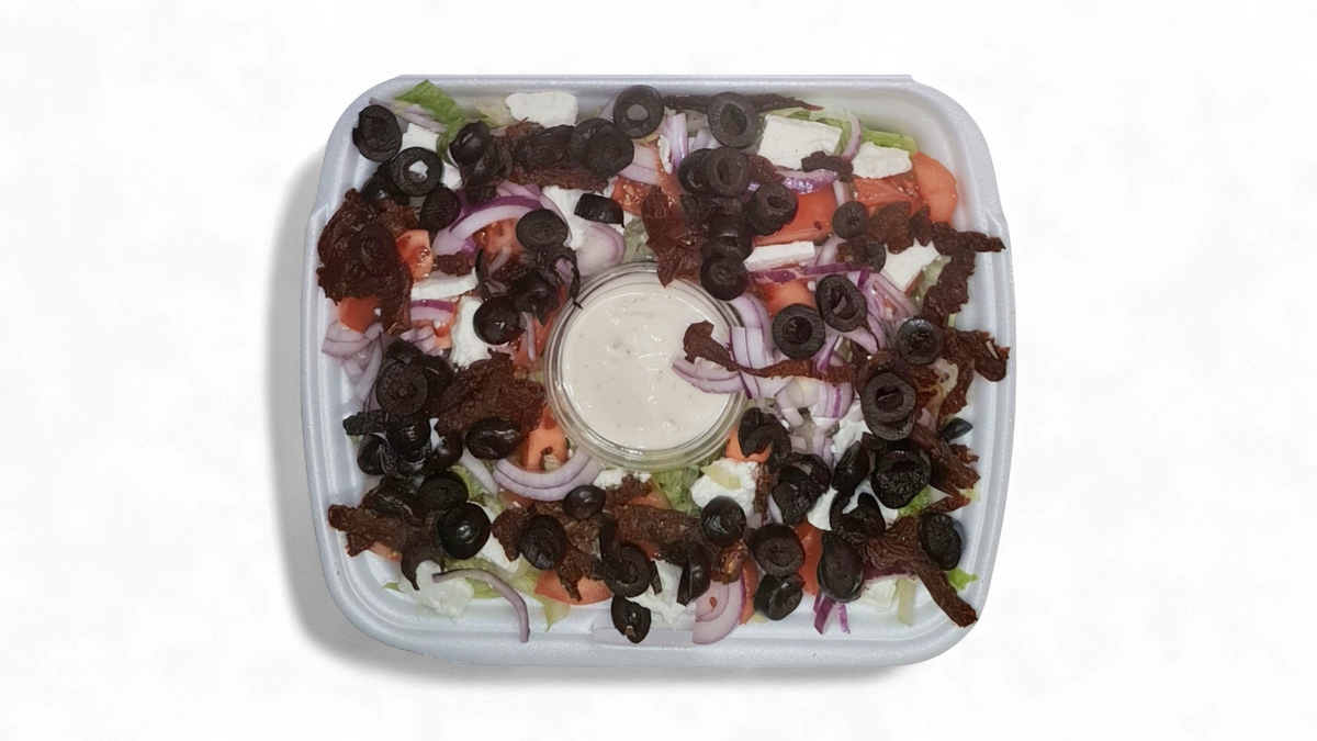 frisk icebergsalat, tomat, feta ost, løg , soltørrede tomater, sort oliven og dressing. Serveres med hjemmelavet brød