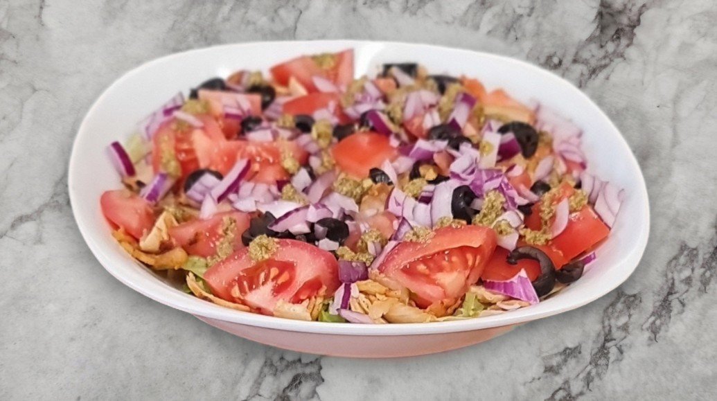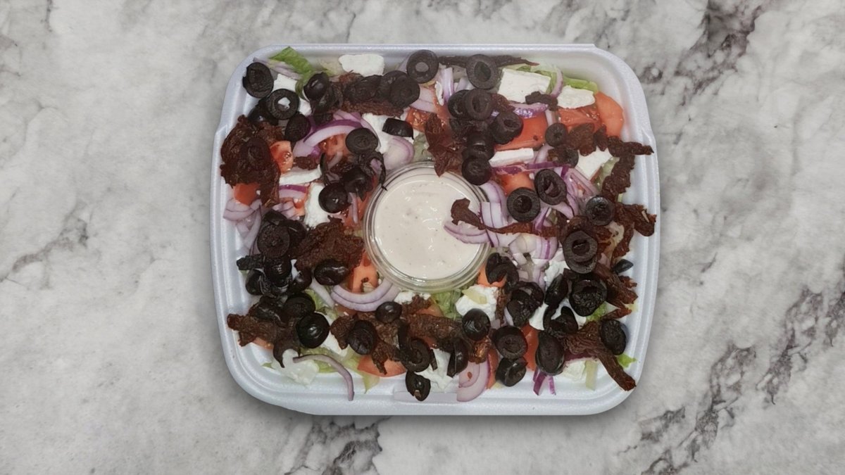frisk icebergsalat, tomat, feta ost, løg , soltørrede tomater, sort oliven og dressing. Serveres med hjemmelavet brød