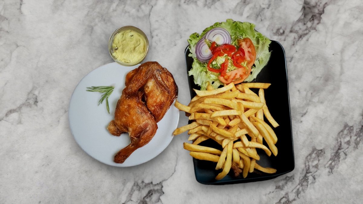 En halv kylling. Serveres med valgfrit tilbehør, blandet salat, valgfri dressing og dyppelse.