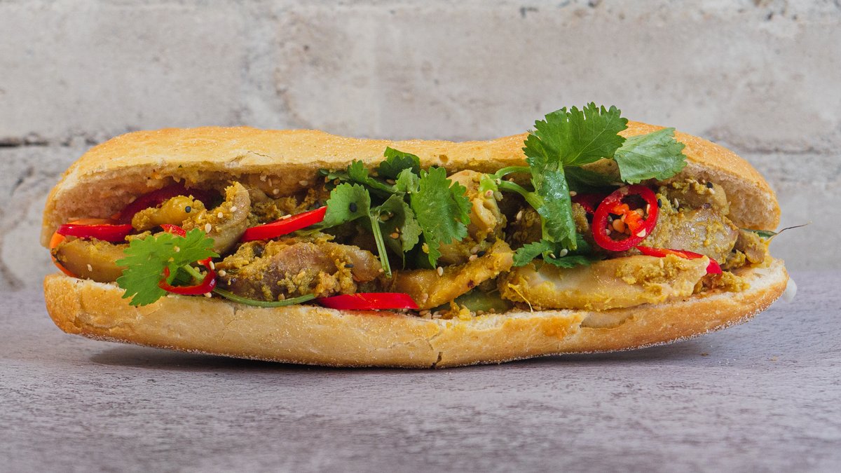 Baguette fyldt karamelliseret tofu, hjemmelavet syltede daikon & gulerødder, agurk, koriander smurt med chili-mayo aioli, peanut.
