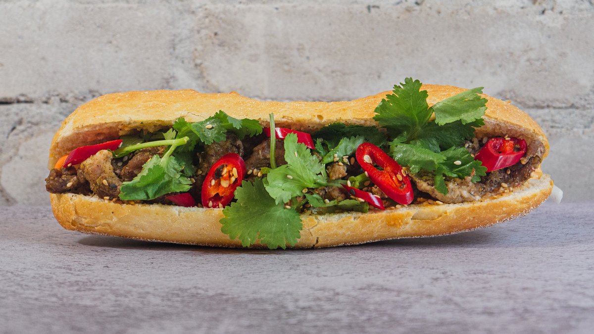 Baguette fyldt med oksekød, citrongræs, hjemmesyltede radiser & gulerødder, agurk, koriander og purløg smurt med chili-mayo, peanut.