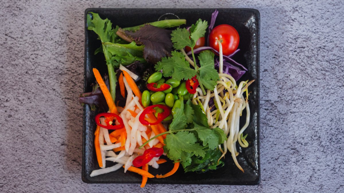 Bowl med frisk tun marineret i spicy soya, shitake, sushiris, avocado, edamame, wakame, ristede løg, peanuts, sprøde grøntsager og urter. Serveres med Goma dressing.