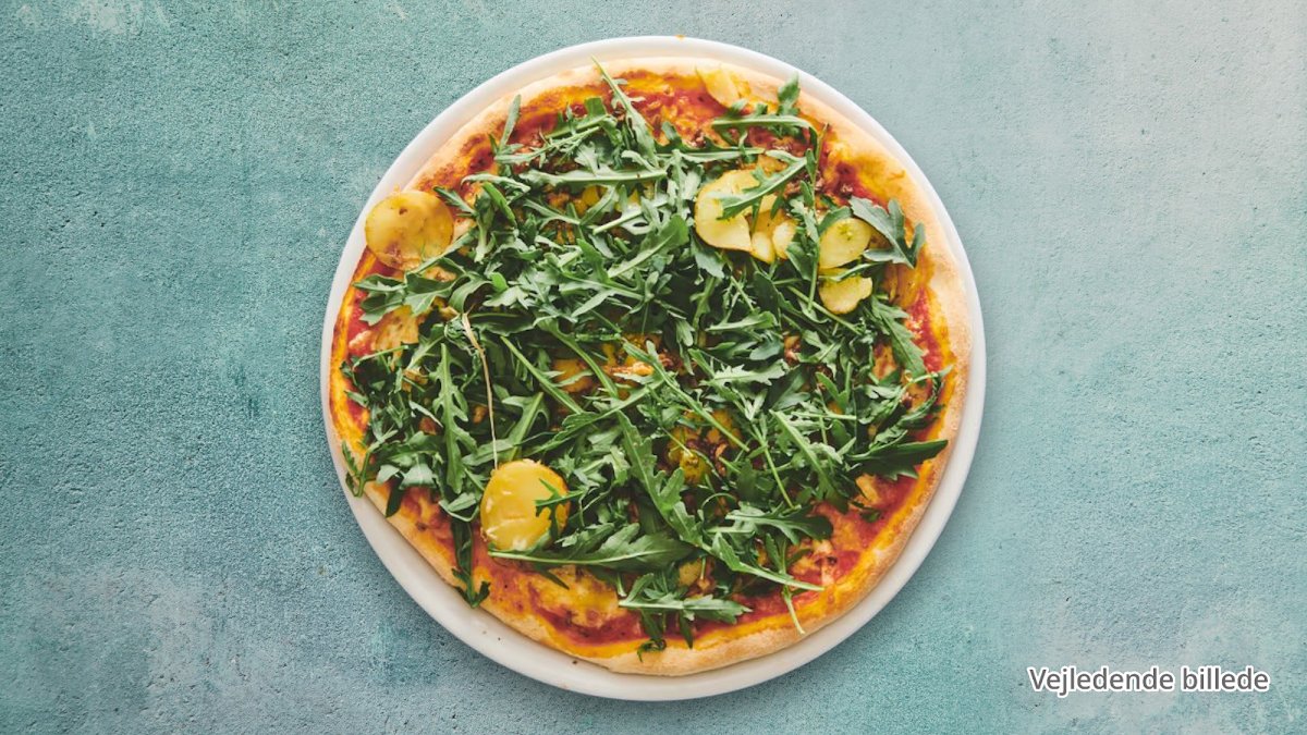 Mascapone, ost, kylling, frisk chili, kartoffelskiver, hvidløg og rucola.
