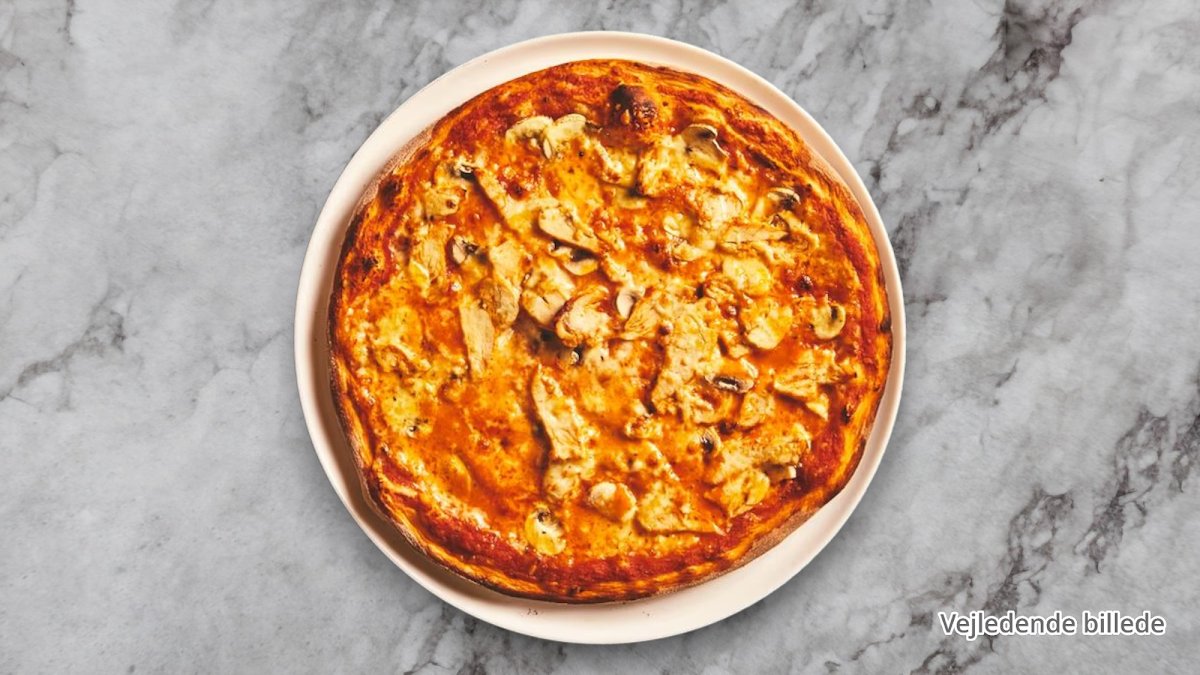 Tomatsauce, ost, kylling, champignon, frisk persille, chili og dressing.