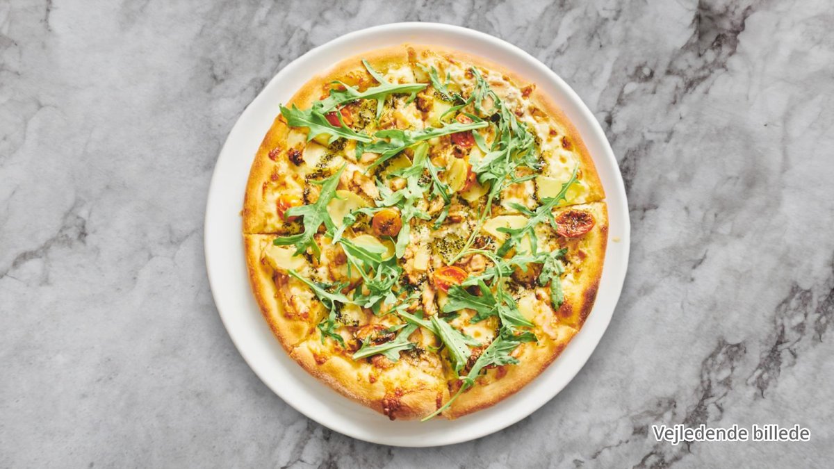 Tomatsauce, ost, kylling, bacon, basilikumspesto og rucola.