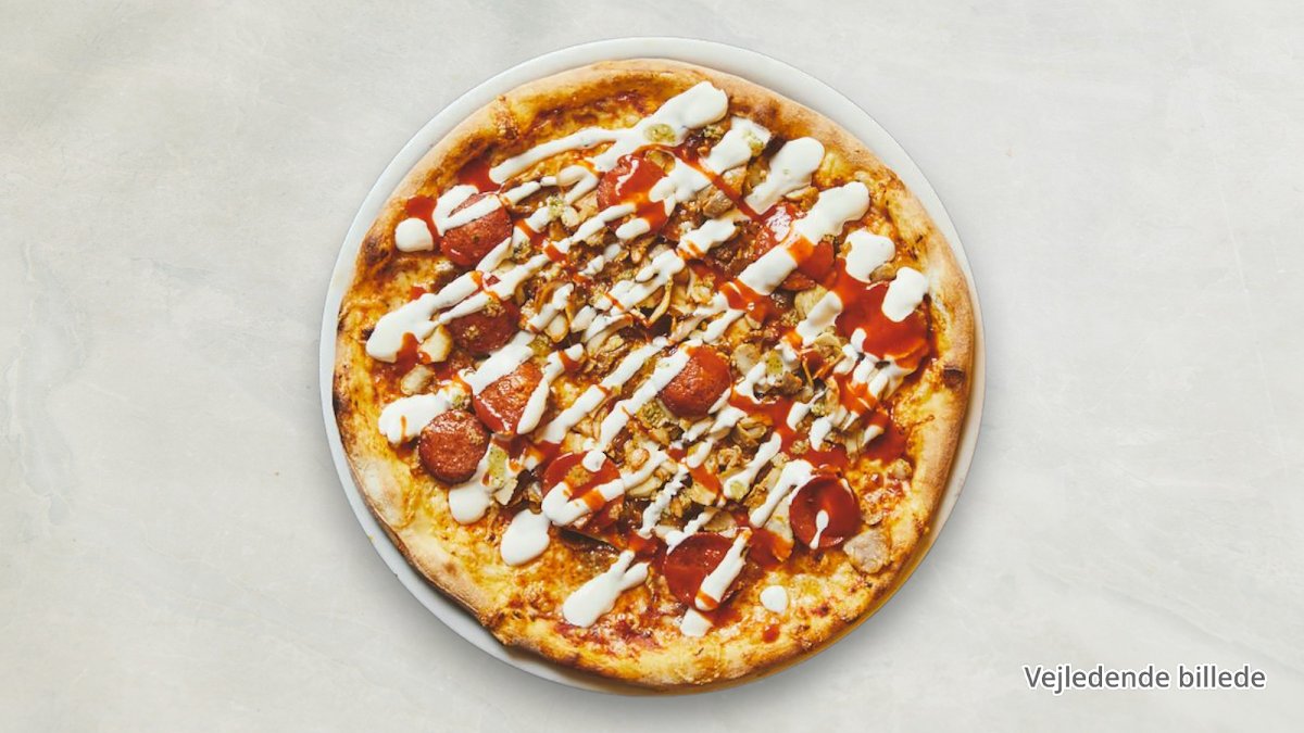 Tomatsauce, ost, skinke, pepperoni, bacon, cocktailpølser og bearnaise.