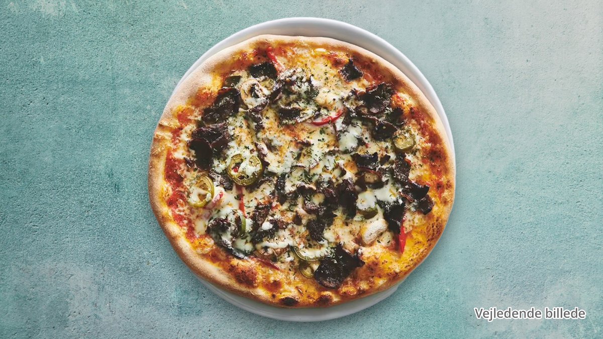 Tomatsauce, ost, kebab, champignon paprika, løg, oliven, jalapeños, og hvidløg.