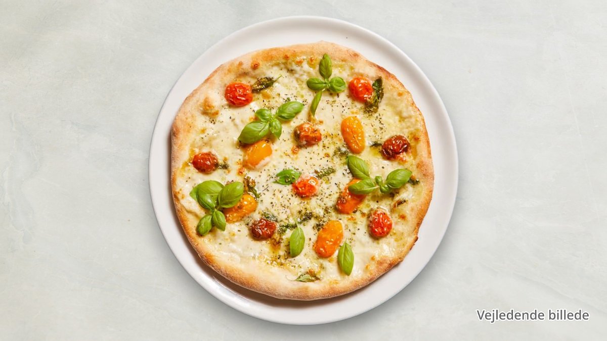 Tomatsauce, ost, hvidløg, basilikumspesto, frisk persille og tomatskiver.