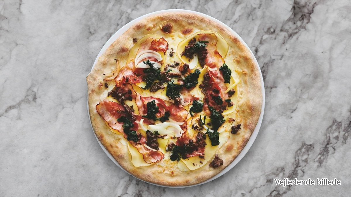 Tomatsauce, ost, skinke og bacon.