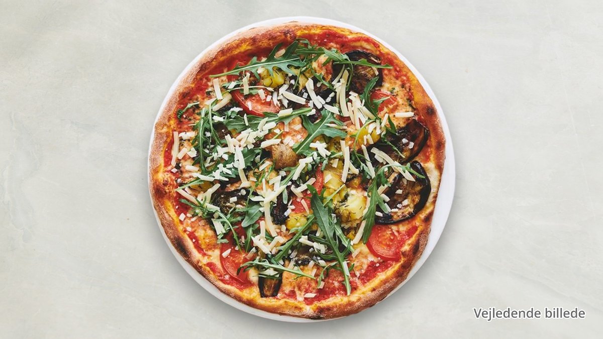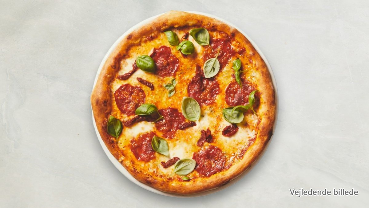 Tomatsauce, ost, skinke og pepperoni.